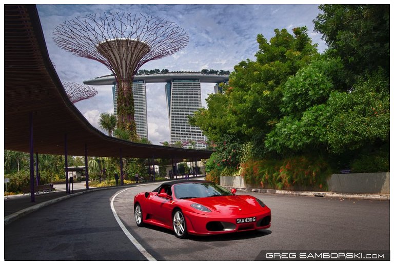 Why It Works: The curved Helix Bridge and reflections from Marina Bay add depth and dynamic contrast to car portraits.
